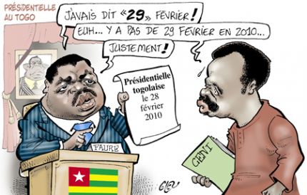 Malgré les multiples tentatives de la part des partis d’opposition, il n’y a pas eu d’accord entre les partis d’opposition et le pouvoir togolais à Ouagadougou le 9 février 2010 sur le report de la présidentielle[viii]. Pourtant, un décret présidentiel du Président Faure Gnassingbé, celui qui officie pour l’ex-parti unique, le Rassemblement du Peuple Togolais (RPT), a permis la convocation du corps électoral togolais en toute illégalité. Comment peut-on convoquer des élections lorsque la liste électorale a été avalisée uniquement par le Président de la CENI sans consensus avec les autres membres de la CENI ? La liste électorale togolaise fait l’objet de contestations de nature à empêcher, d’une part des électeurs togolais de voter, et d’autre part à des non-électeurs de voter par procuration non certifiée.