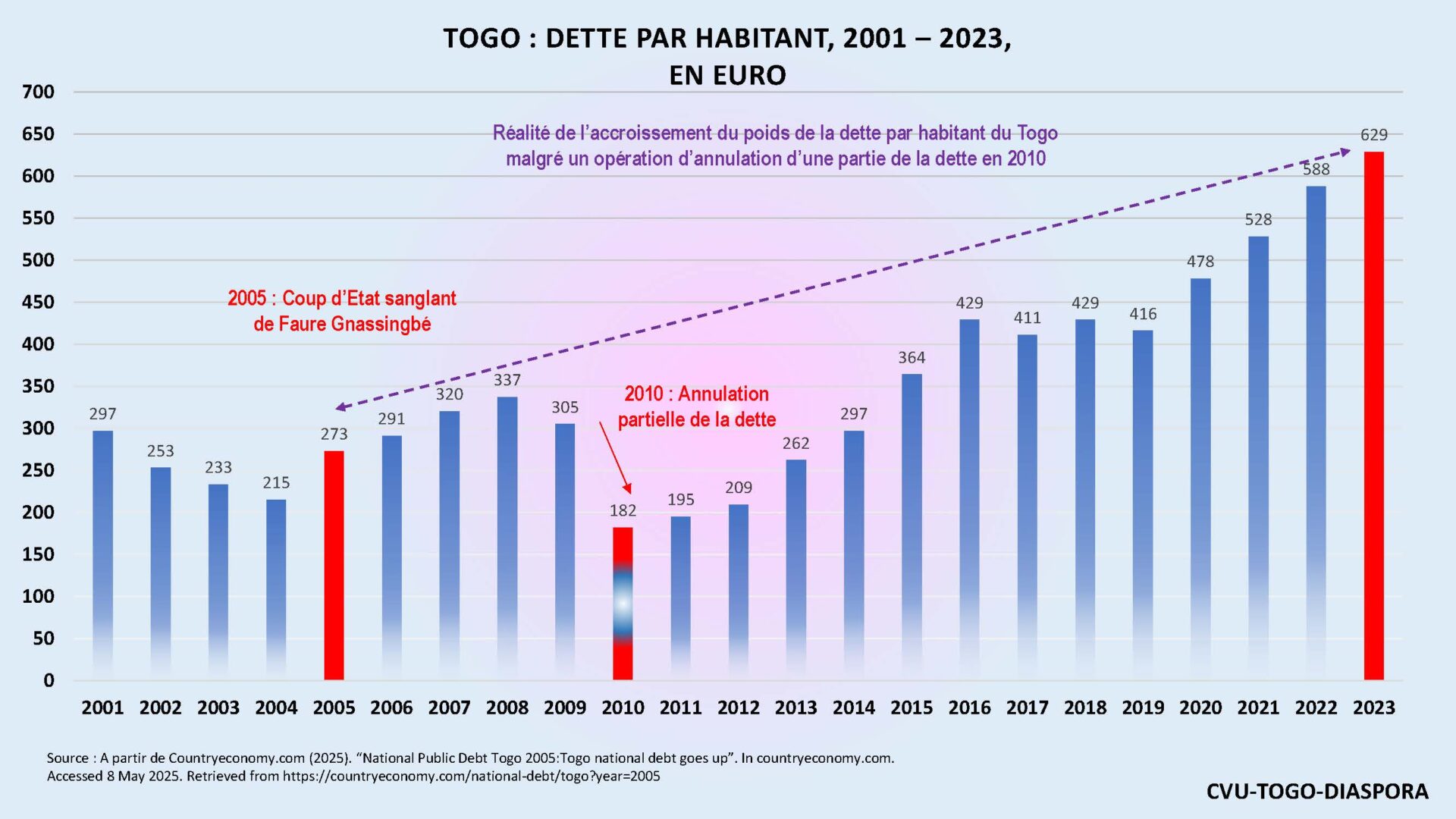 - Countryeconomy.com (2025). “National Public Debt Togo 2005: Togo National Debt Goes Up”. In countryeconomy.com. Accessed 8 May 2025. Retrieved from https://countryeconomy.com/national-debt/togo?year=2005 ↑
